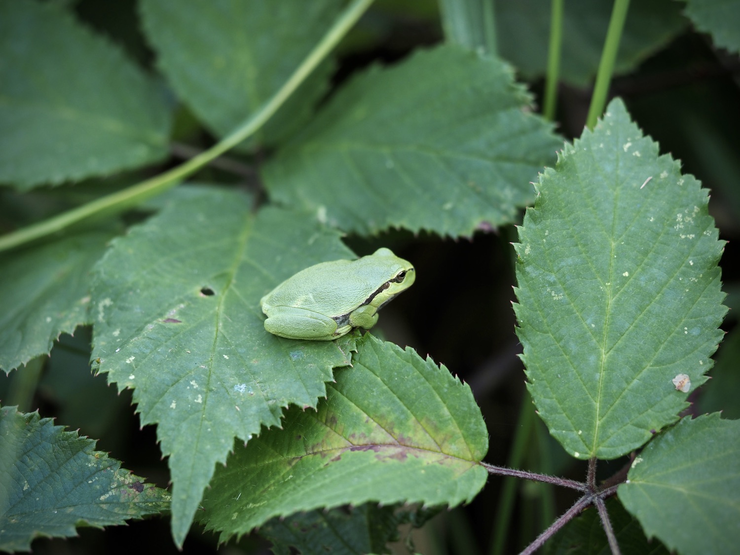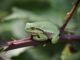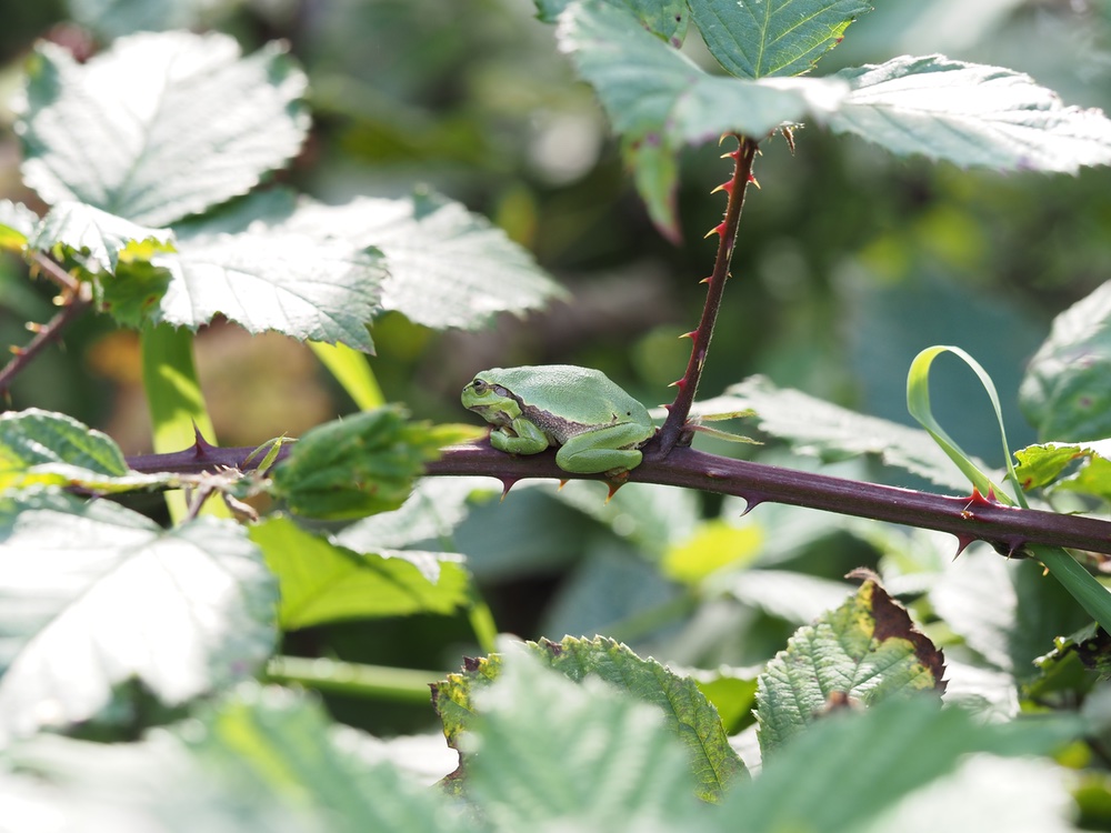 Daar liepen we weer op het zelfde stukje land. Met nog steeds goede hoop, maar weinig tijd omdat mijn cluppie later die middag in actie kwam en dat wilde ik ook niet missen. En toen hoorden we een zacht gekwaak. Het geluid hadden we eerder al opgezocht dus we wisten direct dat het de boomkikkers waren. En ja, ineens zat er eentje op een blad van een struik. Nog kleiner dan ik had bedacht maar zo leuk! Wat een leuke bekroning van deze zoektocht!